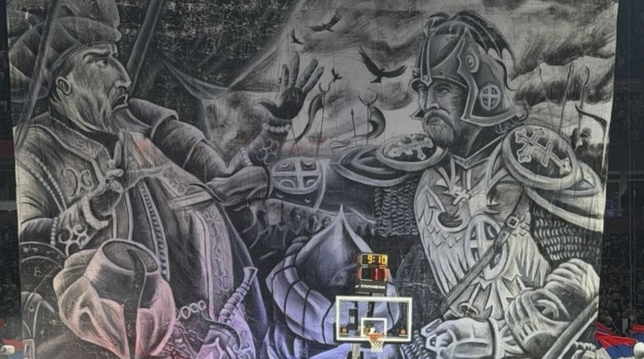 Partizan–Fenerbahçe maçında taraftarlar, Sultan Murad’ın b*çaklandığı anı gösteren pankart açtı.